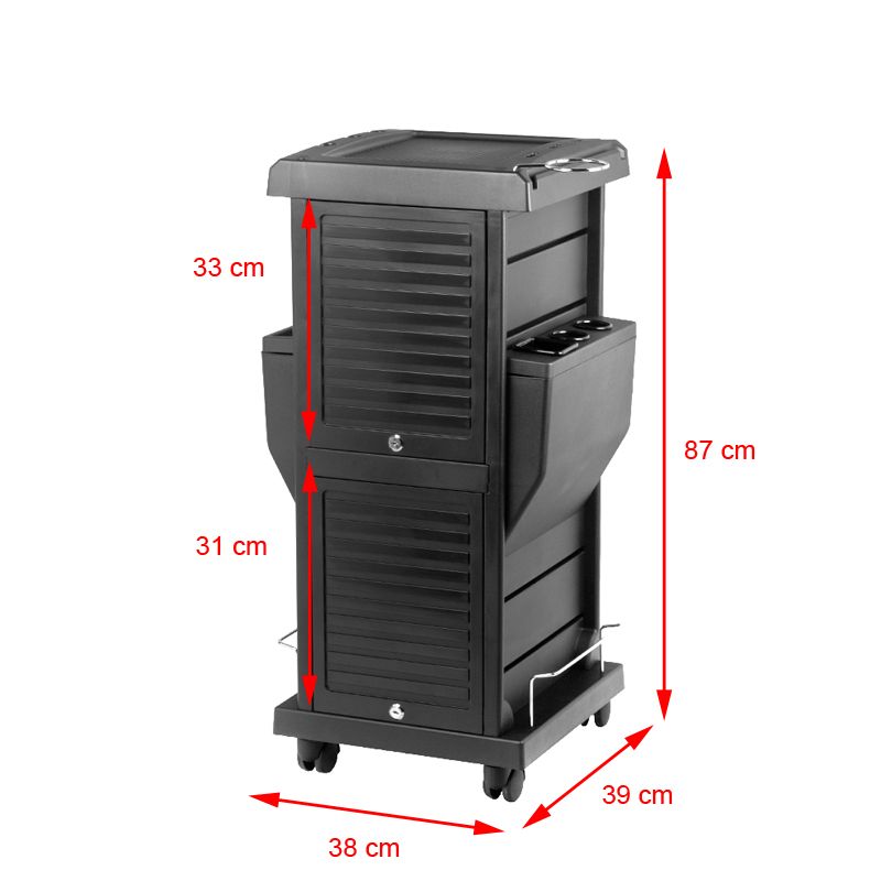 Tyylikäs työkärry jossa on 2 lukittavaa kaappia, kaksi kokoontaitettavaa hyllyä ja hiustenkuivaajan teline. Käytännöllinen ja tilava.