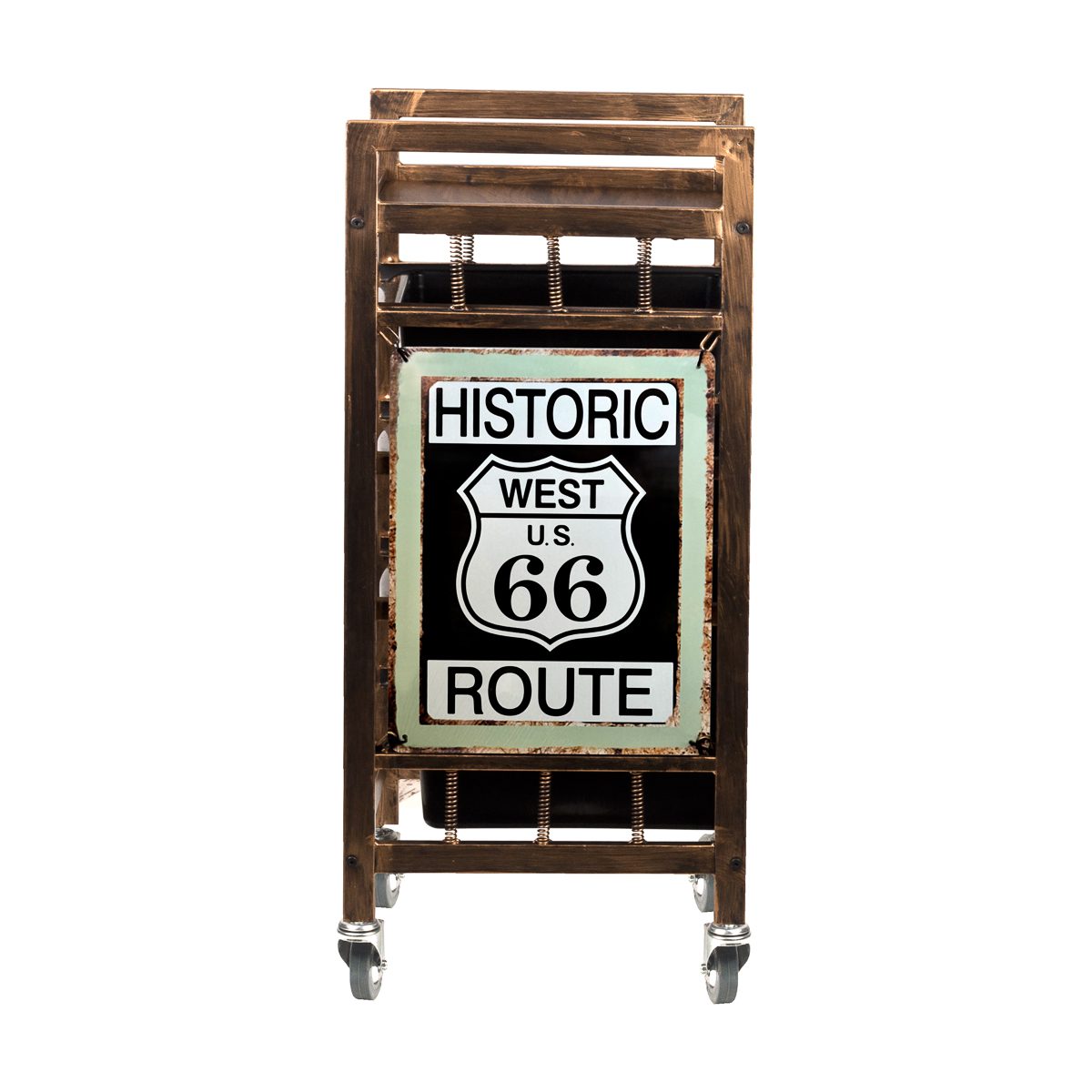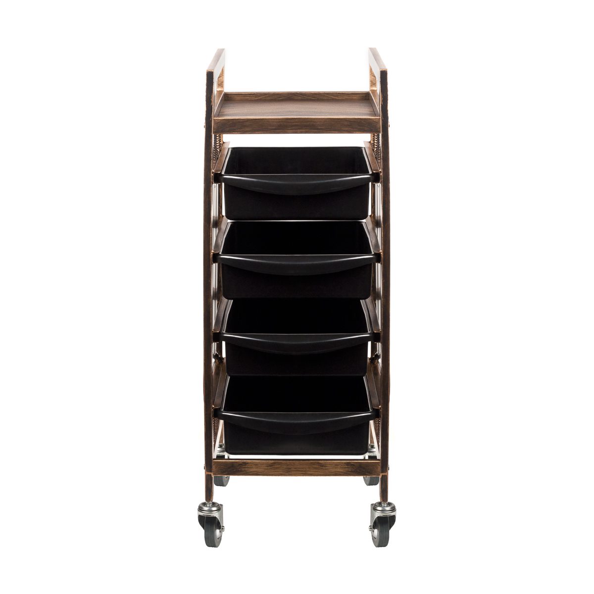 Työkärry vanhan kullan värissä, siinä on 4 laatikkoa ja pitimiä kampaamotarvikkeille. Kumipyörät.