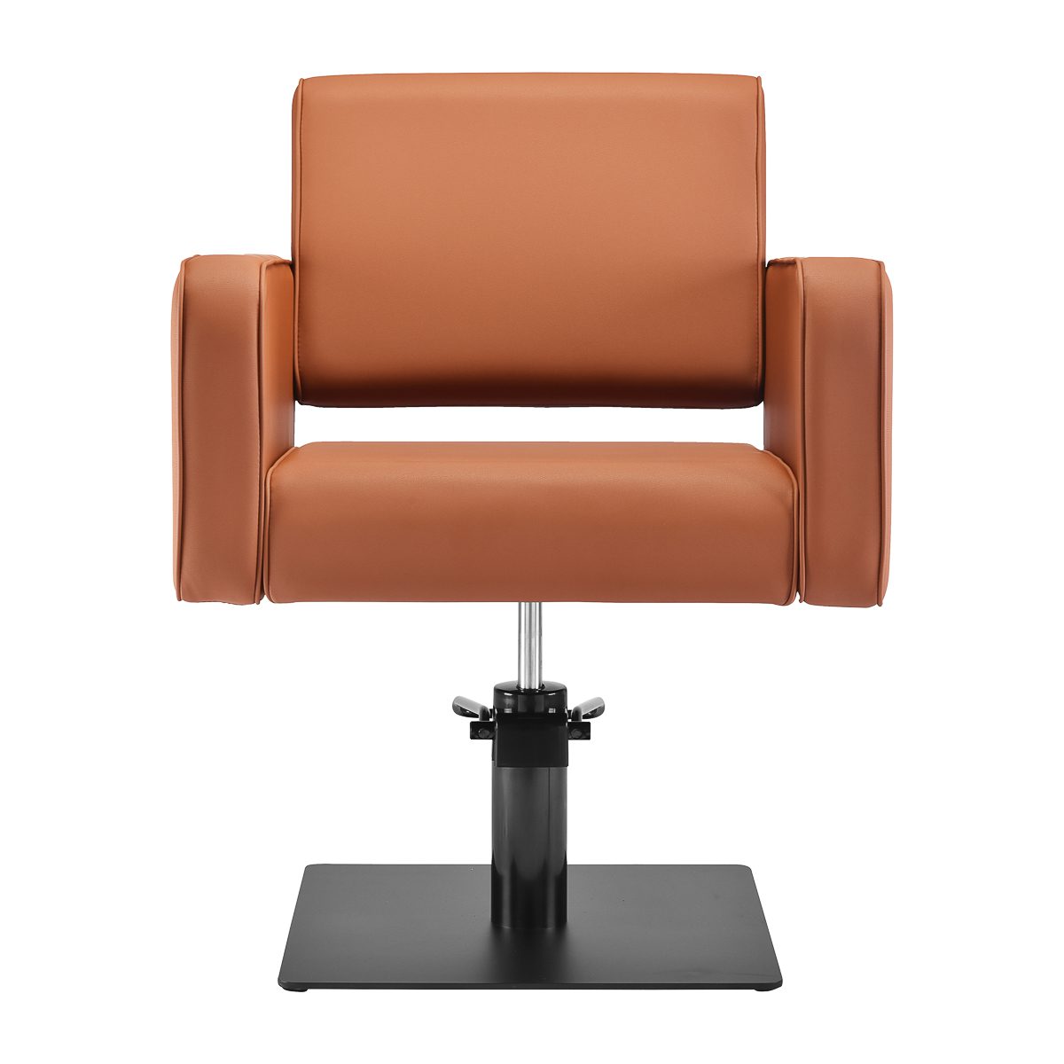 Matta musta neliöjalusta pitää tuolin vakaana. Ruskea keinonahkaverhoilu on helppo pyyhkiä puhtaaksi ja kestää käyttöä. Muotoilu sopii monenlaisiin kampaamotiloihin.