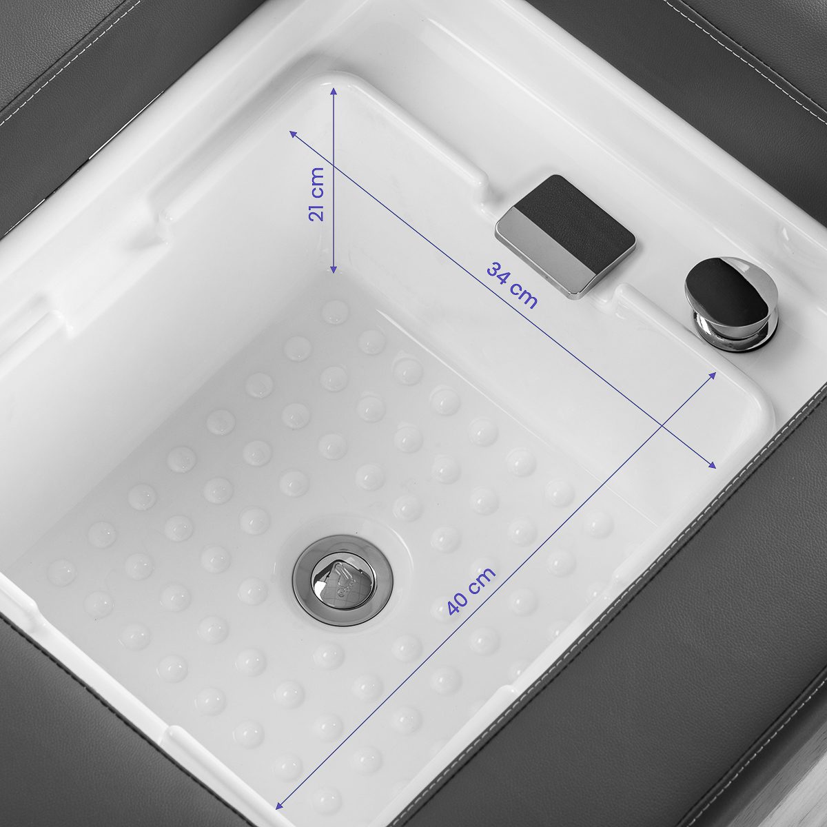 Säädettävä pääntuki, jossa on jatkettava ja säädettävä kallistuskulma, varmistaa täydellisen sopivuuden käyttäjälle ja lisää mukavuutta hoitojen aikana. Setti sisältää ergonomiset tyynyt, mukaan lukien pääntuen, jossa on kasvoaukko. Tämä mahdollistaa hiuspohjahoitojen lisäksi hierontoja sekä monipuolisia vartalo- ja kasvohoidot. Sisäänrakennettu allas laajentaa petin toiminnallisuutta mahdollistaen jalkojenhoitohoidot, mukaan lukien pedikyyrit. Tämä ratkaisu parantaa entisestään rentoutumisen tunnetta ja mahdollistaa entistä kattavamman palveluvalikoiman. Nämä käytännölliset ominaisuudet tekevät pedistä monipuolisen laitteen kauneus- ja hyvinvointisalonkeihin, varmistaen sekä asiakkaan mukavuuden että suoritettujen hoitojen tehokkuuden.