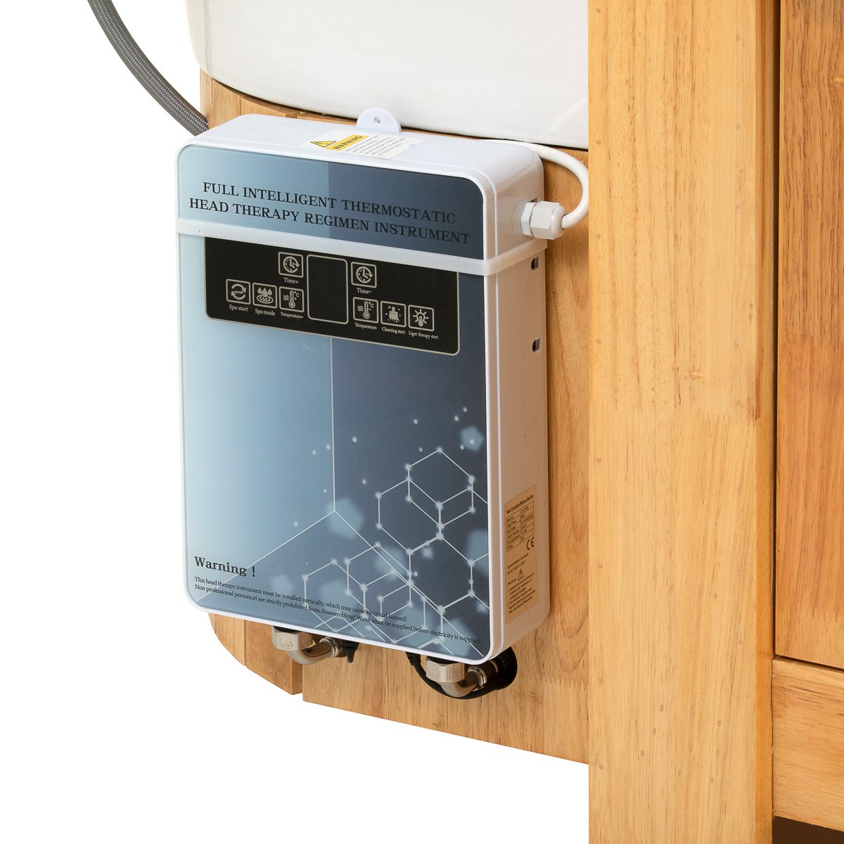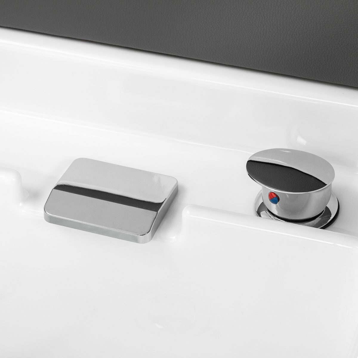 Pesupaikka on varustettu sekoittajalla, joka mahdollistaa helpon lämpötilan säädön asiakkaan mieltymysten mukaan. Käytännöllinen paikka suihkupäälle helpottaa työskentelyä, kun taas tulpalla varustettu siivilä mahdollistaa veden virtauksen hallinnan ja korkeiden hygieniastandardien ylläpitämisen hoitolassa. Vesiliitäntä sijaitsee sisällä altaan alla ja takana suihkupellin alla, mikä piilottaa asennuksen esteettisesti. Ergonomisesti muotoiltu hoitotuoli tarjoaa mukavuutta ja riittävän tuen hoitojen aikana, ja mukana toimitettu rahi lisää henkilökunnan mukavuutta. Toiminnallisuuden ja mukavuuden yhdistelmä tekee tästä pesupaikasta monipuolisen laitteen sekä kampaamoihin että SPA-hoitoloihin.
