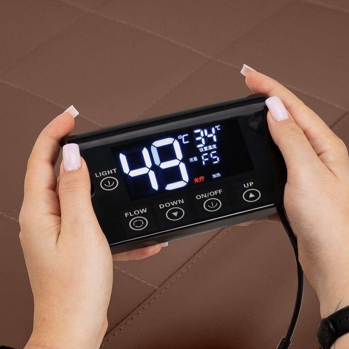 Paneelista voi säätää aikaa, veden lämpötilaa ja valoterapian valoja. Mukana on myös kaukosäädin höyrylaitteen ohjaamiseen.