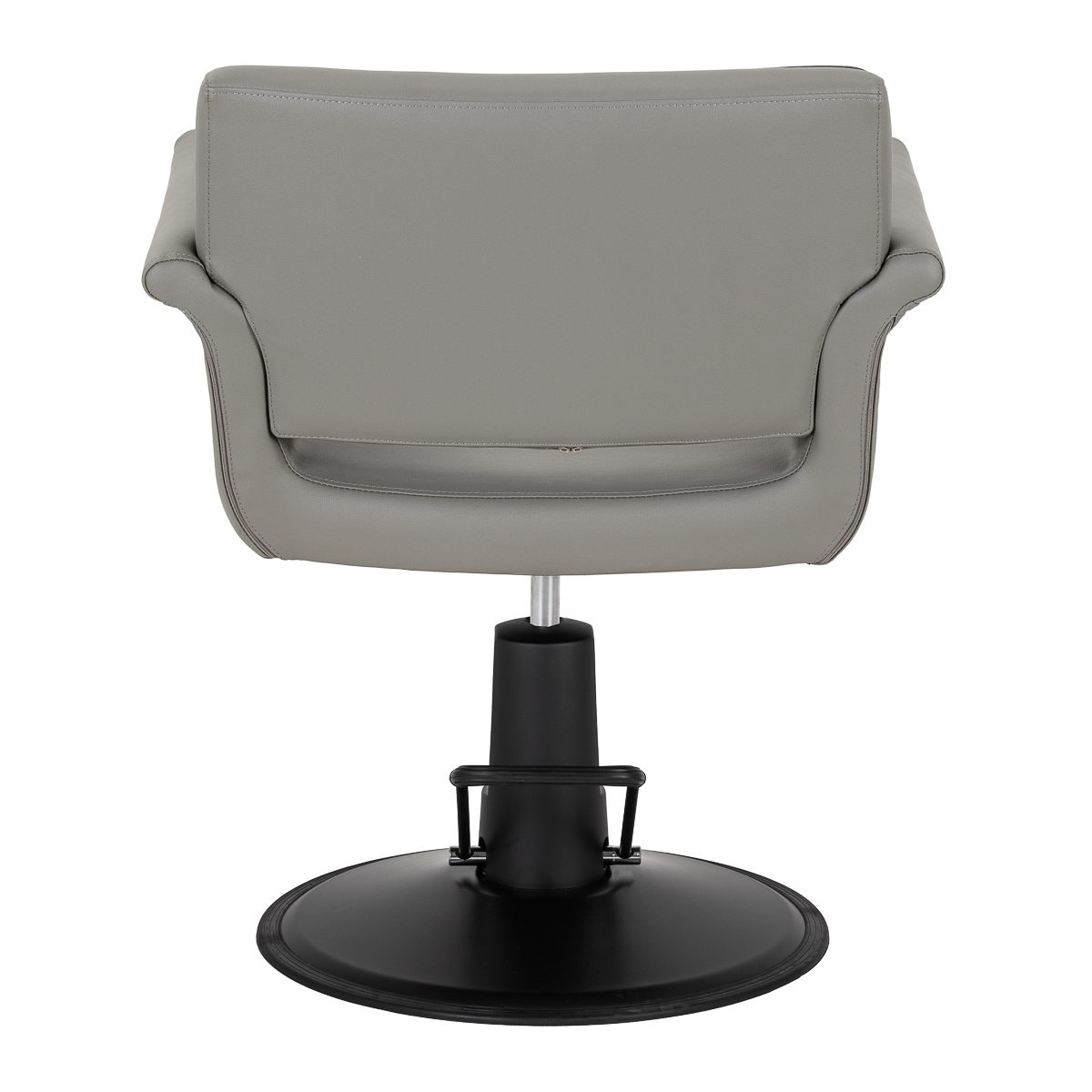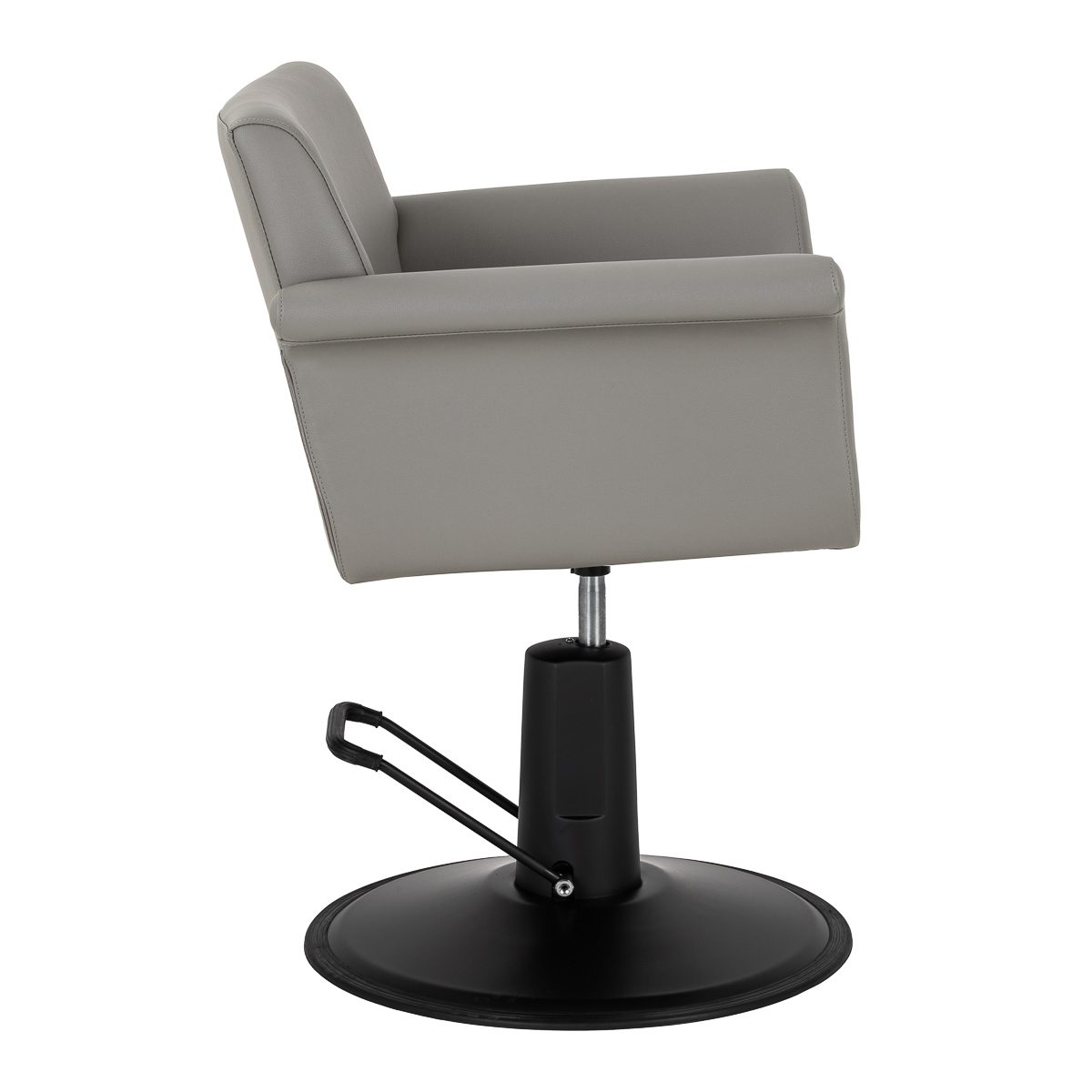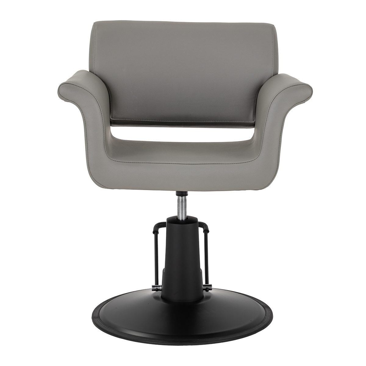 Pyöreä musta jalusta pitää tuolin vakaasti paikallaan. Harmaa keinonahkaverhoilu on miellyttävä ja helppo pitää puhtaana. Materiaalit kestävät hyvin käyttöä ja kosteutta. Ulospäin kaarevat käsinojat tuovat tuoliin selkeän ja siistin ilmeen. Malli sopii monenlaisiin kampaamotiloihin.