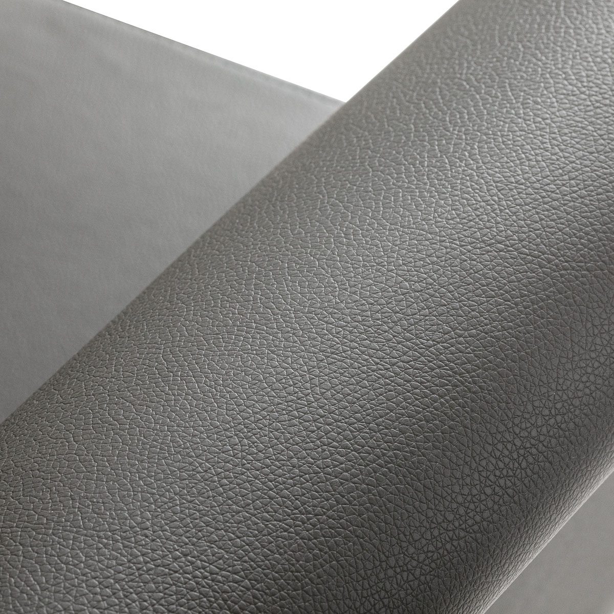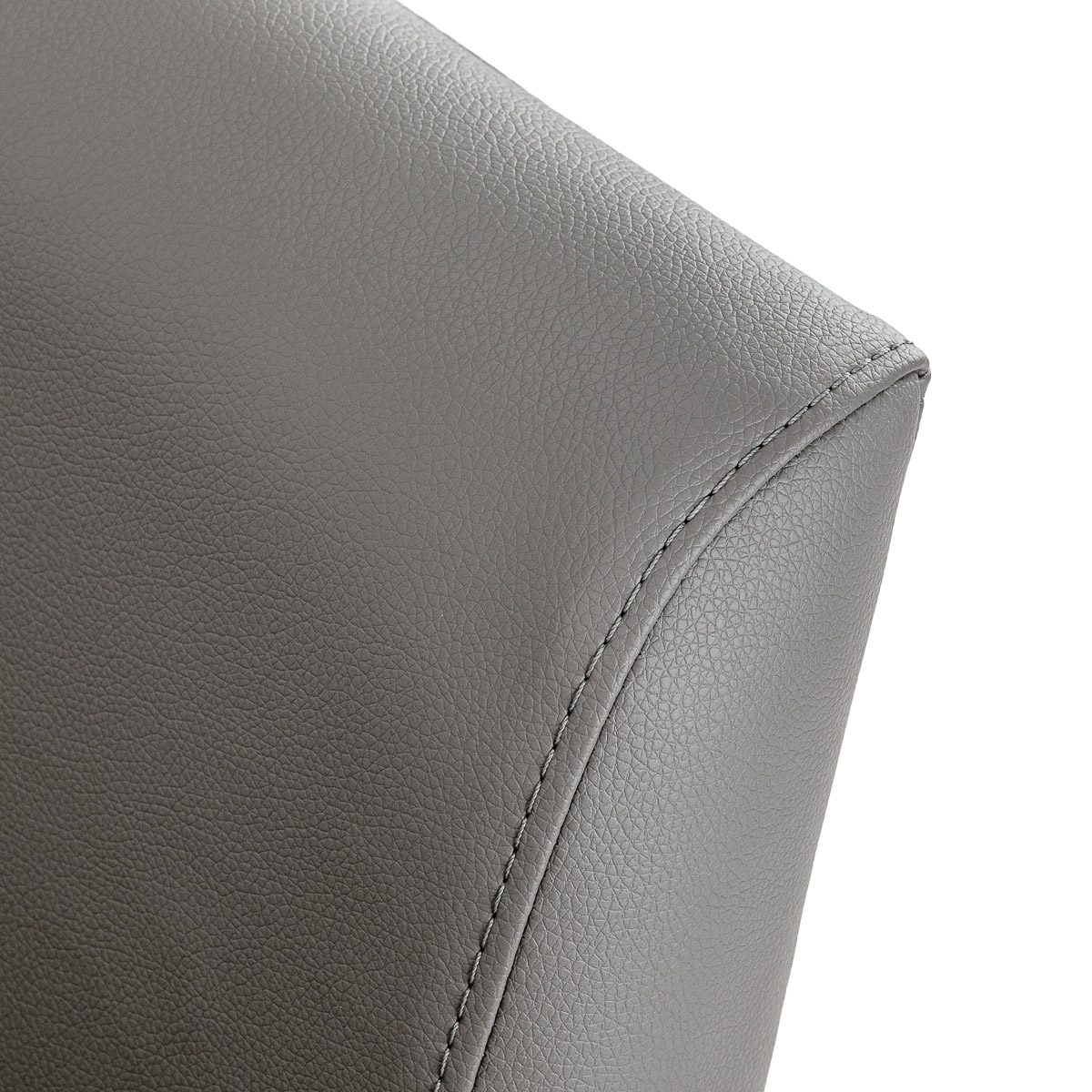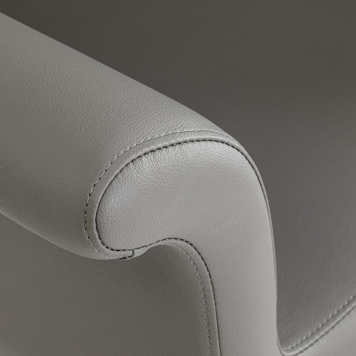 Pyöreä musta jalusta pitää tuolin vakaasti paikallaan. Harmaa keinonahkaverhoilu on miellyttävä ja helppo pitää puhtaana. Materiaalit kestävät hyvin käyttöä ja kosteutta. Ulospäin kaarevat käsinojat tuovat tuoliin selkeän ja siistin ilmeen. Malli sopii monenlaisiin kampaamotiloihin.