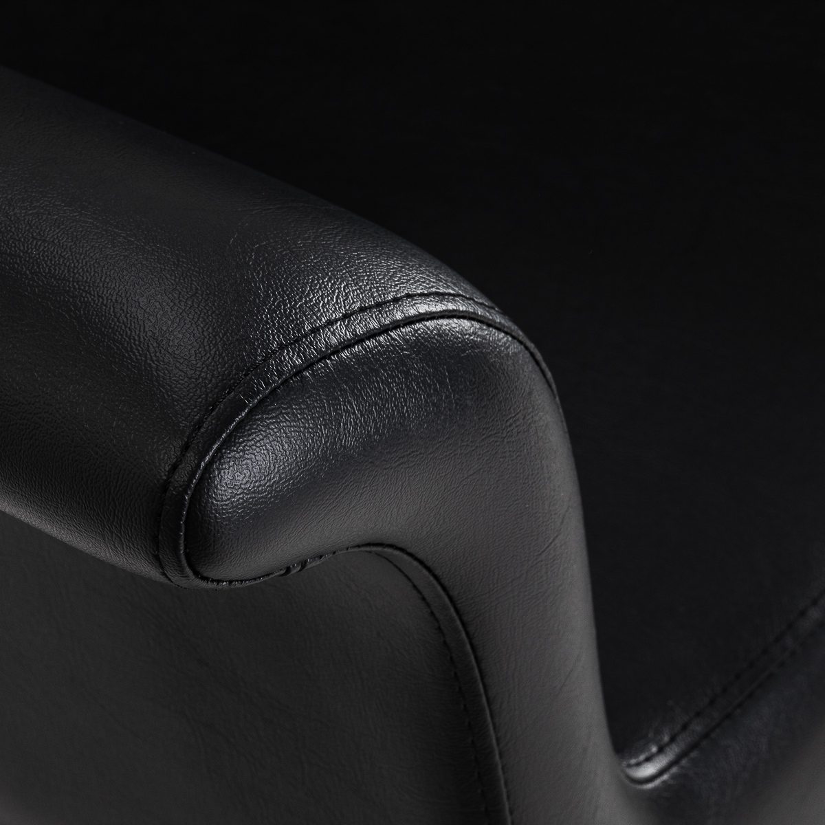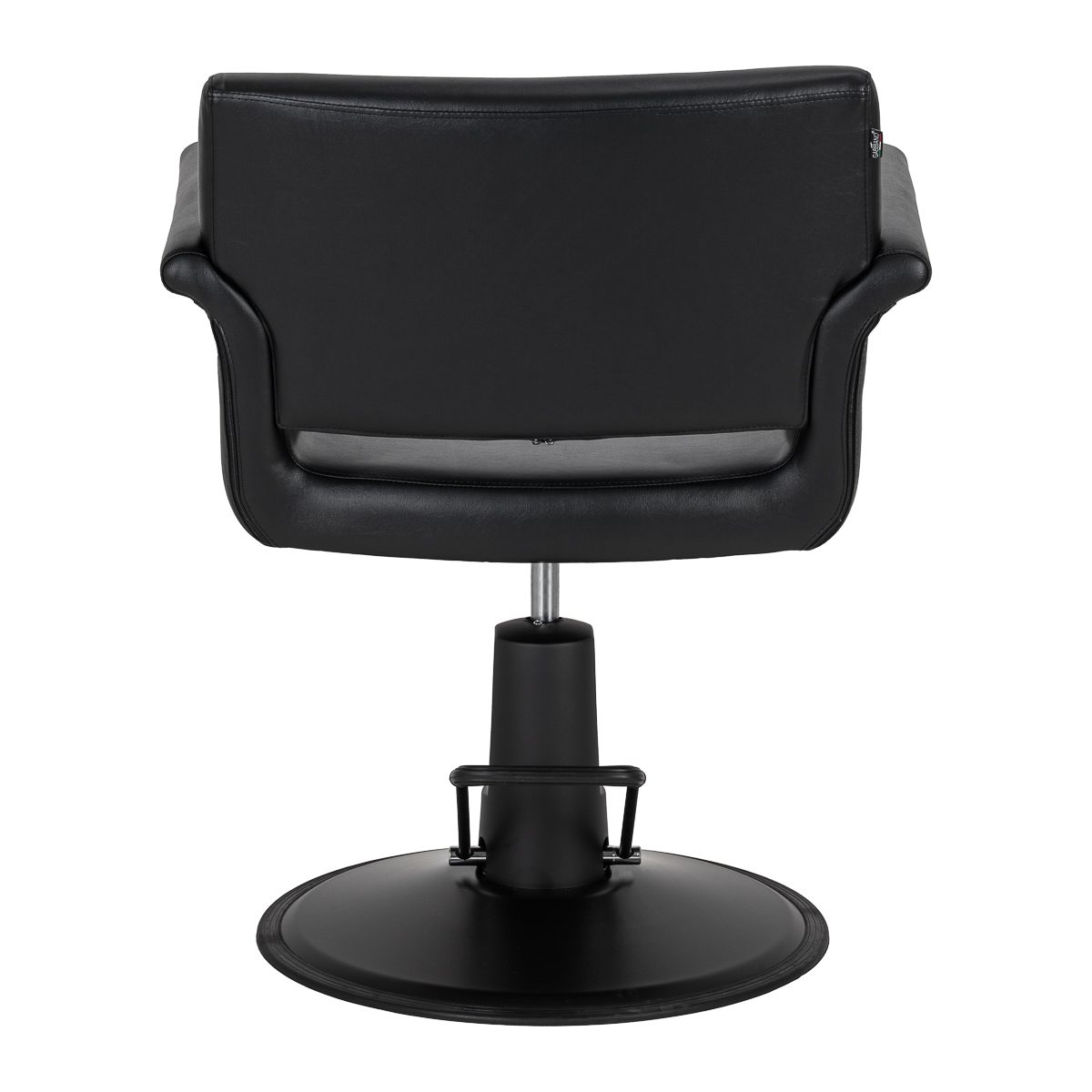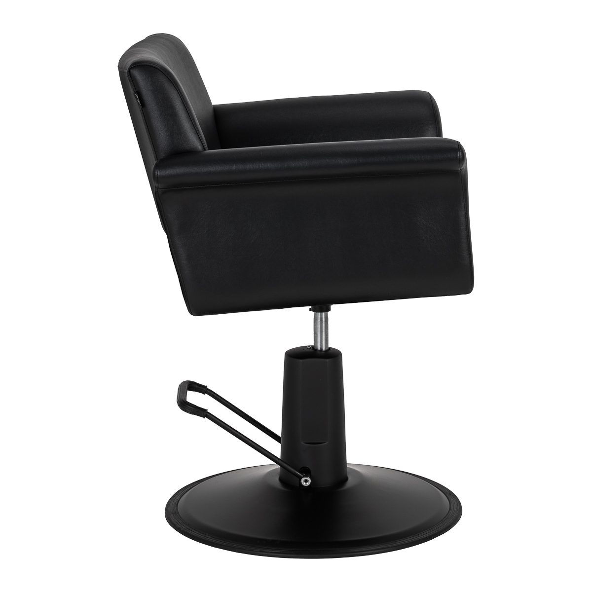 Pyöreä musta jalusta pitää tuolin vakaasti paikallaan. Musta keinonahkaverhoilu on miellyttävä ja helppo pitää puhtaana. Materiaalit kestävät hyvin käyttöä ja kosteutta. Ulospäin kaarevat käsinojat tuovat tuoliin selkeän ja siistin ilmeen. Malli sopii monenlaisiin kampaamotiloihin.
