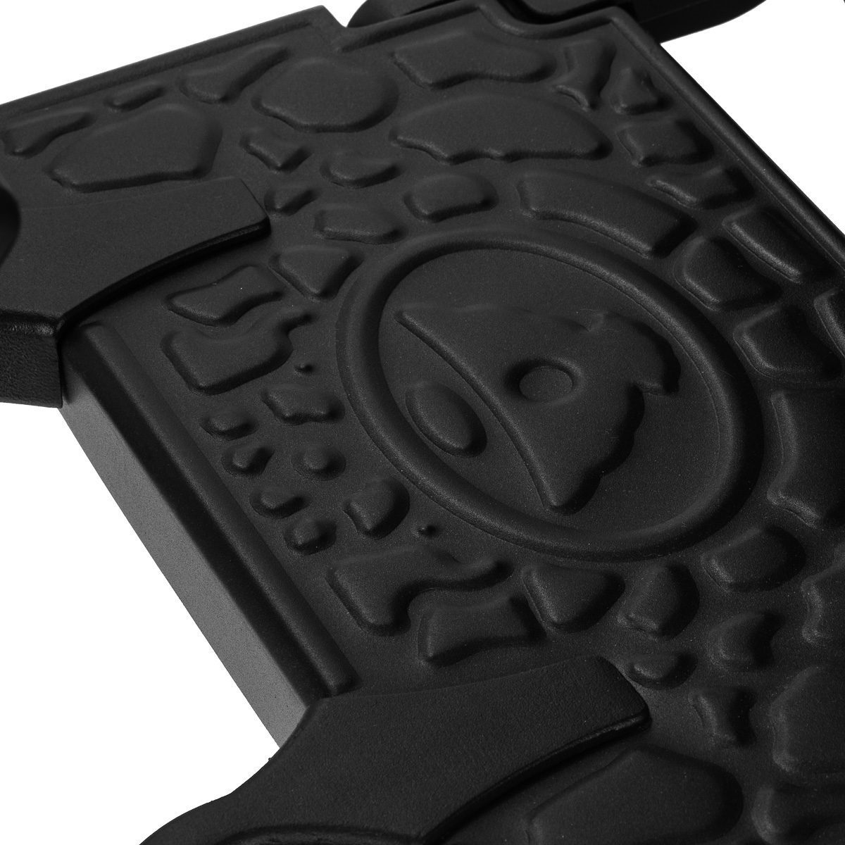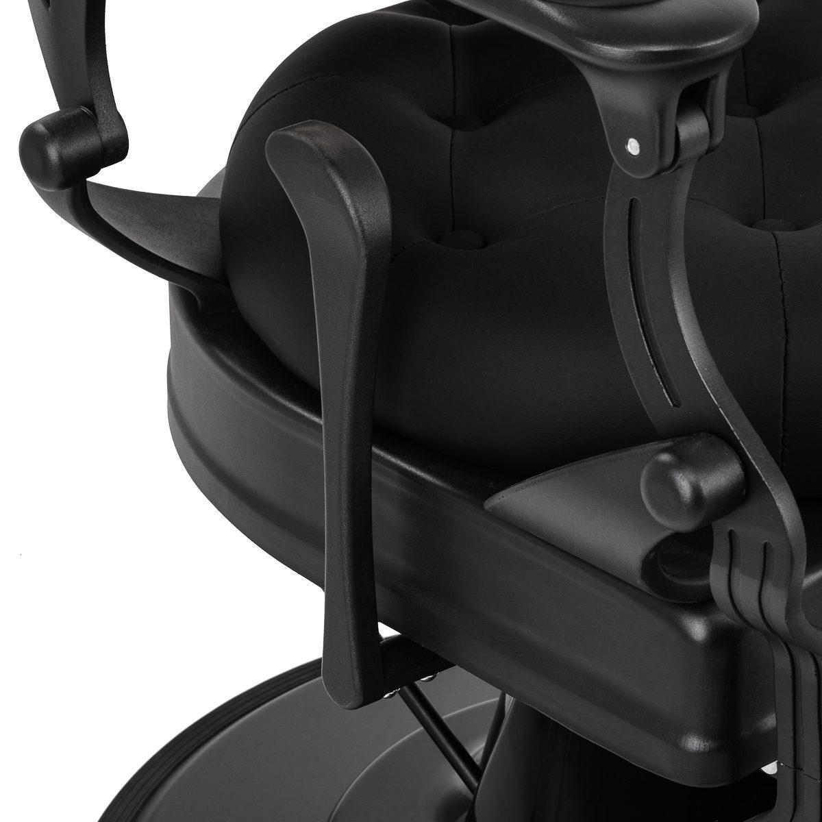 Jalustan vankka rakenne takaa vakauden ja korkean käyttömukavuuden. Istuimen täyte kestävää, muotonsa pitävää vaahtomuovia sekä miellyttävän tuntuisesta keinonahasta valmistettu mattapintainen verhoilu takaavat kalusteen kestävyyden ja mukavan käytön pitkäksi aikaa. Käytetyt materiaalit tekevät myös kalusteesta kosteudenkestävän, kestävän ja helpon puhdistaa. Musta verhoilu tikkauksilla ja koristenapeilla sekä koristeltu jalkatuki antavat sille ainutlaatuisen luonteen. Tuoli, jolla on tunnusomainen, vintage-tyyliin viittaava muotoilu, sopii täydellisesti parturiliikkeiden tunnelmaan korostaen niiden ainutlaatuista ilmapiiriä.