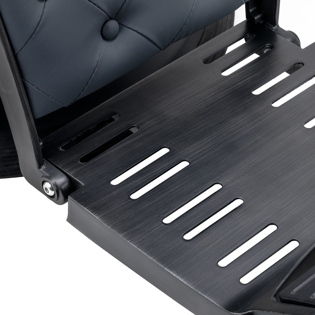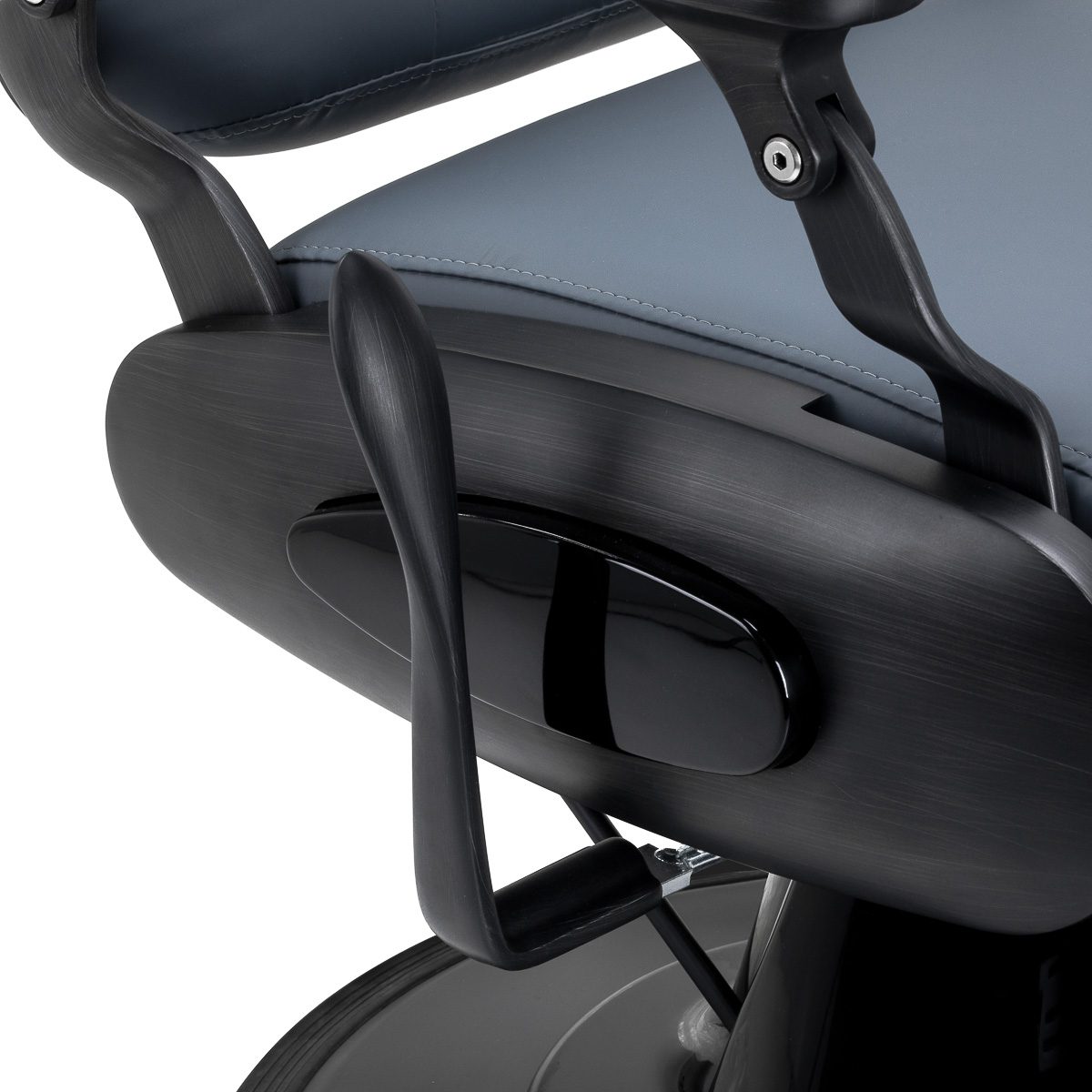 Harjatun mustan rungon ja grafiitinharmaan verhoilun yhdistelmä luo näyttävän kontrastin. Pintamateriaalina käytetty kestävä, kosteutta hylkivä ja helposti puhdistettava synteettinen nahka sekä laadukas, muotonsa säilyttävä vaahtomuovipehmuste takaavat istuinmukavuuden ja pitkäikäisyyden. Koristeelliset napit ja pyörösomisteet tuovat tuoliin klassista tyyliä. Moottoripyöräinspiraation saanut viimeistely tekee tästä tuolista erottuvan katseenvangitsijan – täydellinen valinta ilmeikkääseen parturisalonkiin.