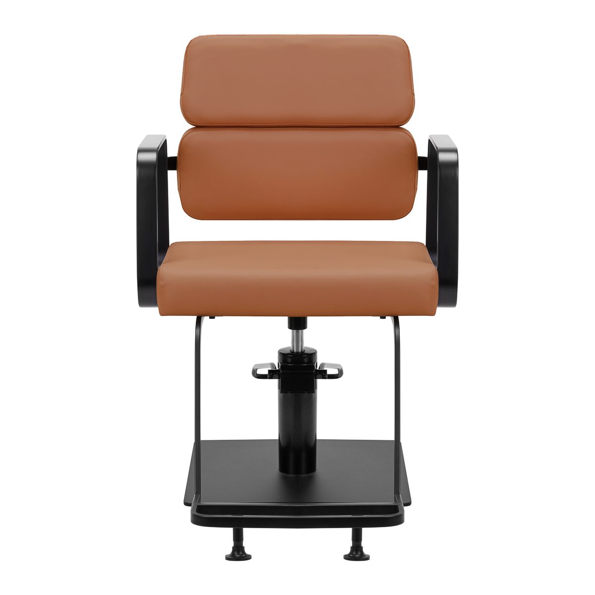360 asteen pyörintä mahdollistaa kampaajalle joustavan ja tehokkaan työskentelyn. Vakaa, neliönmuotoinen pohjalevy takaa tukevuuden koko hoidon ajan. Matta pinta tuo ilmettä ja on samalla helppo pitää puhtaana. Pehmustettu istuin takaa miellyttävän käyttökokemuksen myös pidempien toimenpiteiden aikana. Metalliset käsinojat tukevat asiakkaan hartioita, jolloin pää pysyy ryhdikkäässä asennossa – tämä helpottaa mm. tarkkaa leikkaustyötä. Mukana toimitettava jalkatuki lisää istuinmukavuutta ja vakautta.