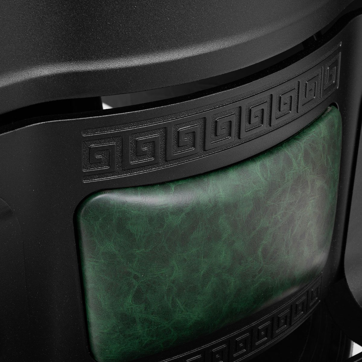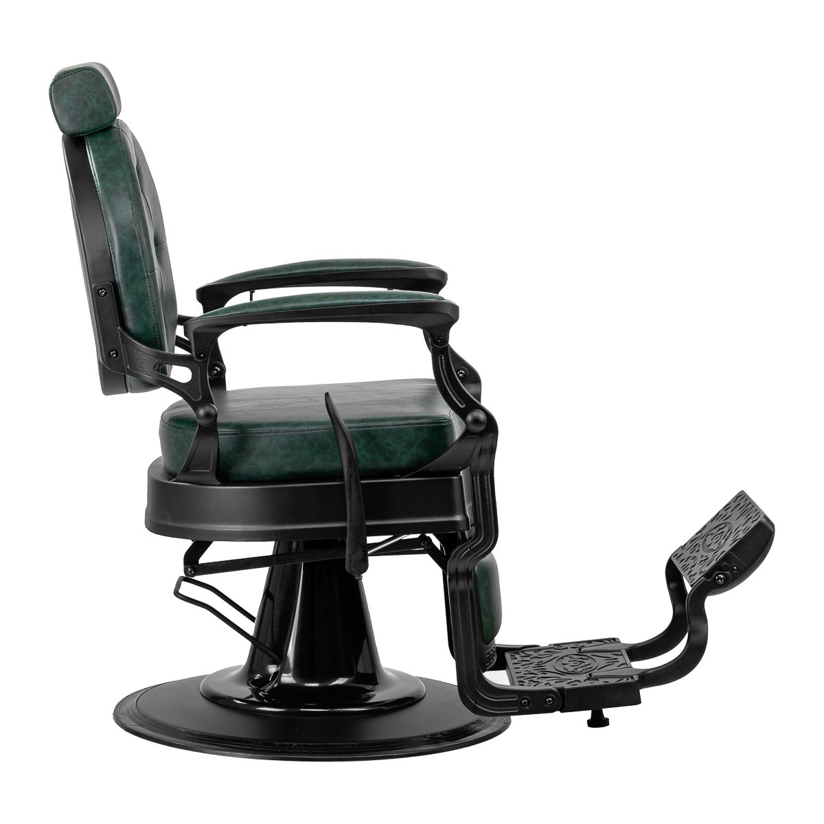 Jalustan vankka rakenne takaa vakauden ja korkean käyttömukavuuden. Istuimen täyte kestävää, muotonsa pitävää vaahtomuovia sekä miellyttävän tuntuisesta keinonahasta valmistettu puolimatta verhoilu takaavat kalusteen kestävyyden ja mukavan käytön pitkäksi aikaa. Ne tekevät myös kalusteesta kosteudenkestävän, kestävän ja helpon puhdistaa. Vihreä verhoilu tikkauksilla ja koristenapeilla antaa sille ainutlaatuisen luonteen. Tuoli, jolla on tunnusomainen, vintage-tyyliin viittaava muotoilu, sopii täydellisesti parturiliikkeiden tunnelmaan korostaen niiden ainutlaatuista ilmapiiriä.