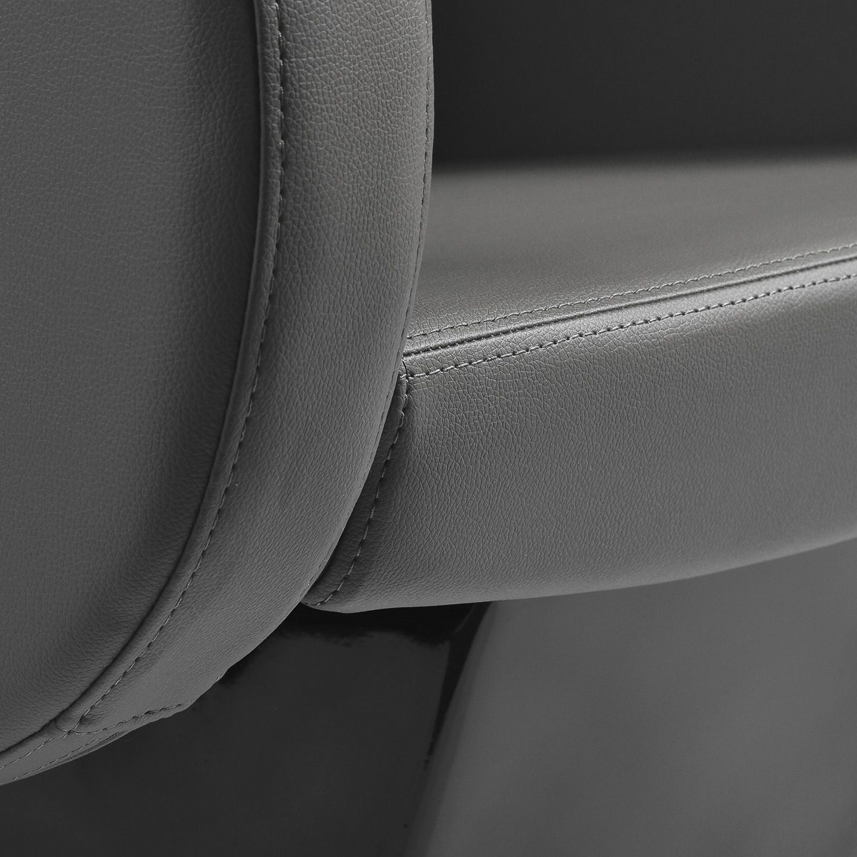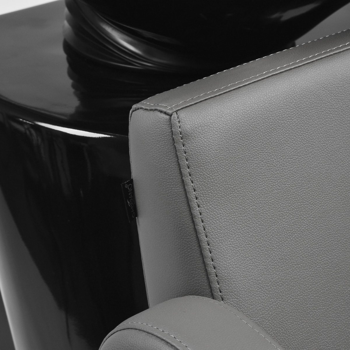 Istuin on täytetty kestävällä vaahtomuovilla ja verhoiltu harmaalla keinonahalla, joka on helppo pyyhkiä puhtaaksi. Käsinojat ja selkänoja tukevat asiakkaan asentoa hoidon aikana. Mustat vesihanat, suihkupää ja letkut sisältyvät settiin.