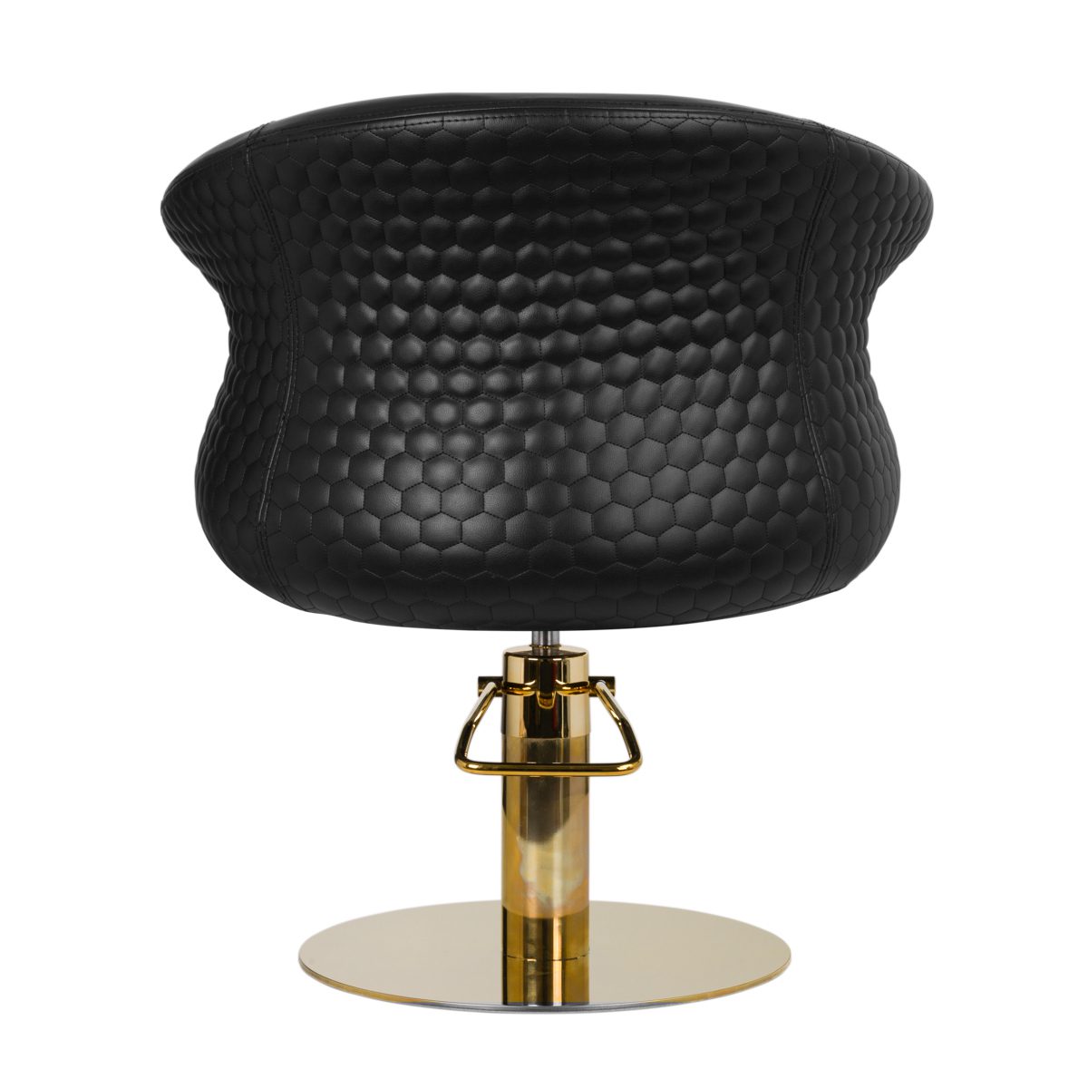 Tyylikäs kampaamotuoli ainutlaatuisella muotoilulla. Erityisesti profiloitu tarjoamaan asiakkaalle mukavan asennon toimenpiteen aikana. Korkeudensäätö. Erittäin vakaa ja vankka. Verhoilu korkealaatuisesta tekonahasta. Musta väri kultaisilla elementeillä. Lakatut metallipinnat.