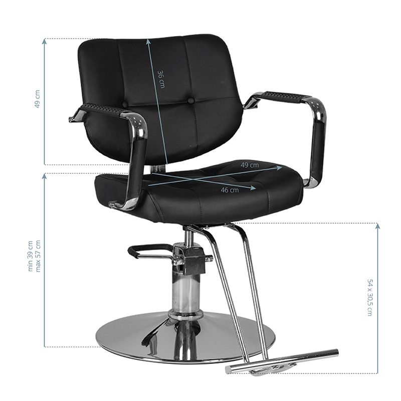 Moderni kampaamotuoli modernilla. Säädettävä korkeus. Erittäin vakaa ja vankka. Verhoilu on korkealaatuisesta eko-nahasta. Musta väri.