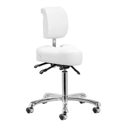 Viisijalkainen tukeva jalusta takaa erinomaisen vakauden myös intensiivisessä käytössä. Kumipyörät mahdollistavat kevyen ja lattiaa vahingoittamattoman liikkumisen. Laadukas, kosteutta kestävä ja helposti puhdistettava valkoinen keinonahkaverhoilu parantaa käyttömukavuutta ja tekee tuolista käytännöllisen valinnan vaativaan ammattilaiskäyttöön.