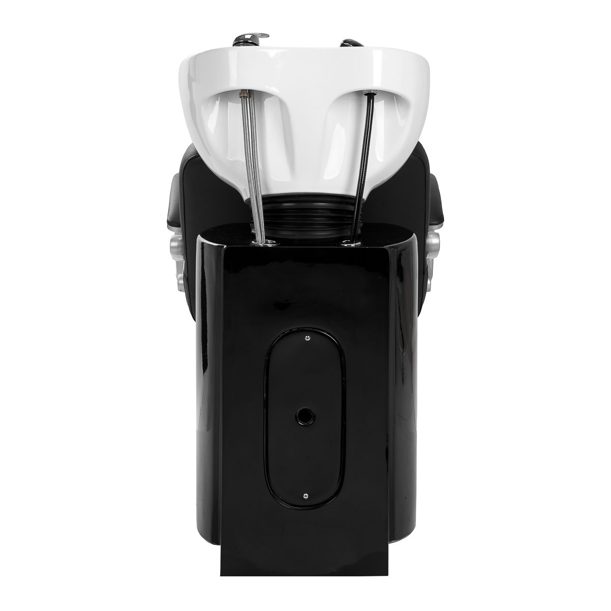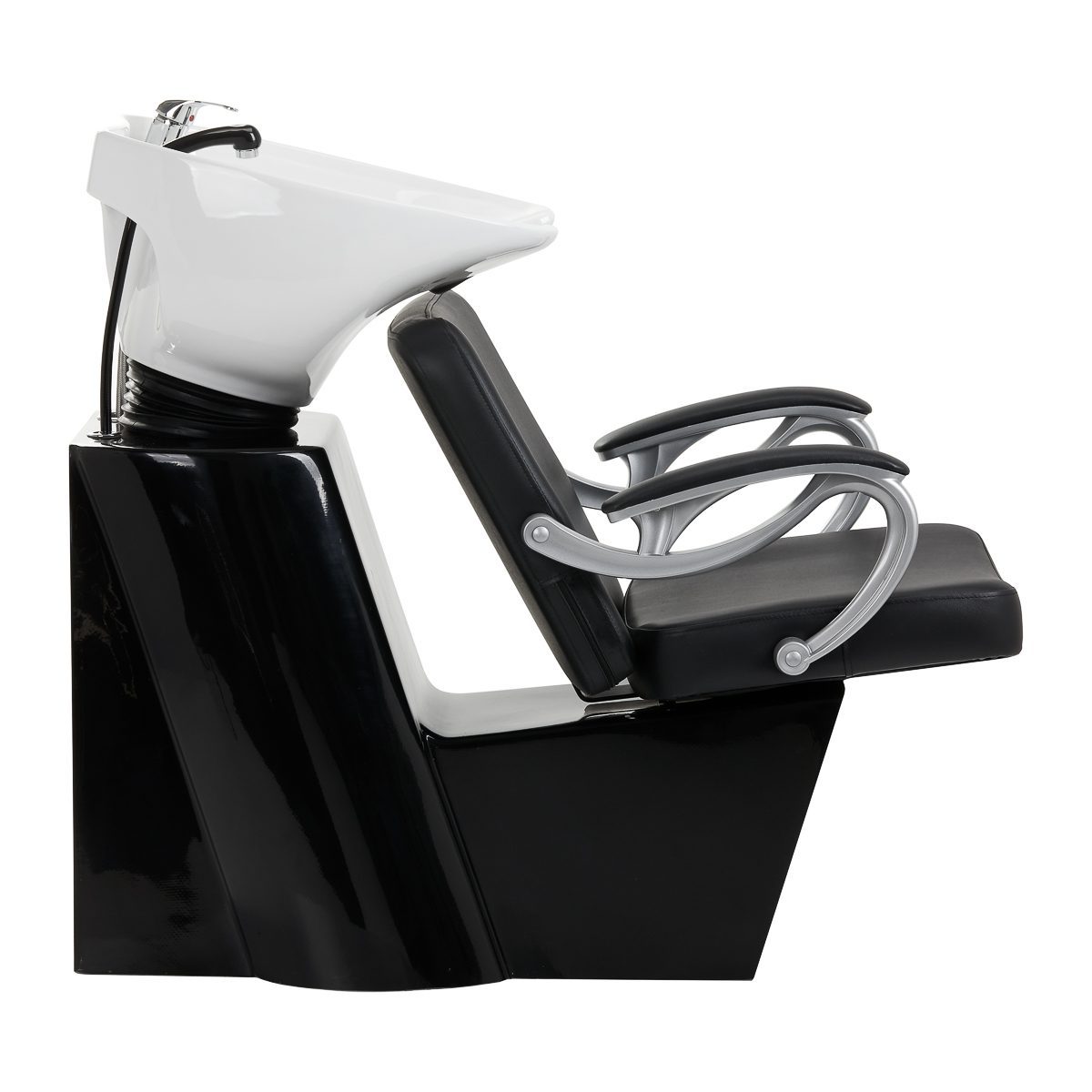 Yhdistelmä toimivuutta ja italialaista eleganssia. Valmistettu korkealaatuisimmista materiaaleista ja siinä on täydellinen viimeistely. Pehmeä ja erittäin mukava istuin on päällystetty korkealaatuisella mustalla eko-tekonahalla. Valkoinen keraaminen allas ja metalliset käsinojat. Ihanteellinen moderniin kampaamoon.