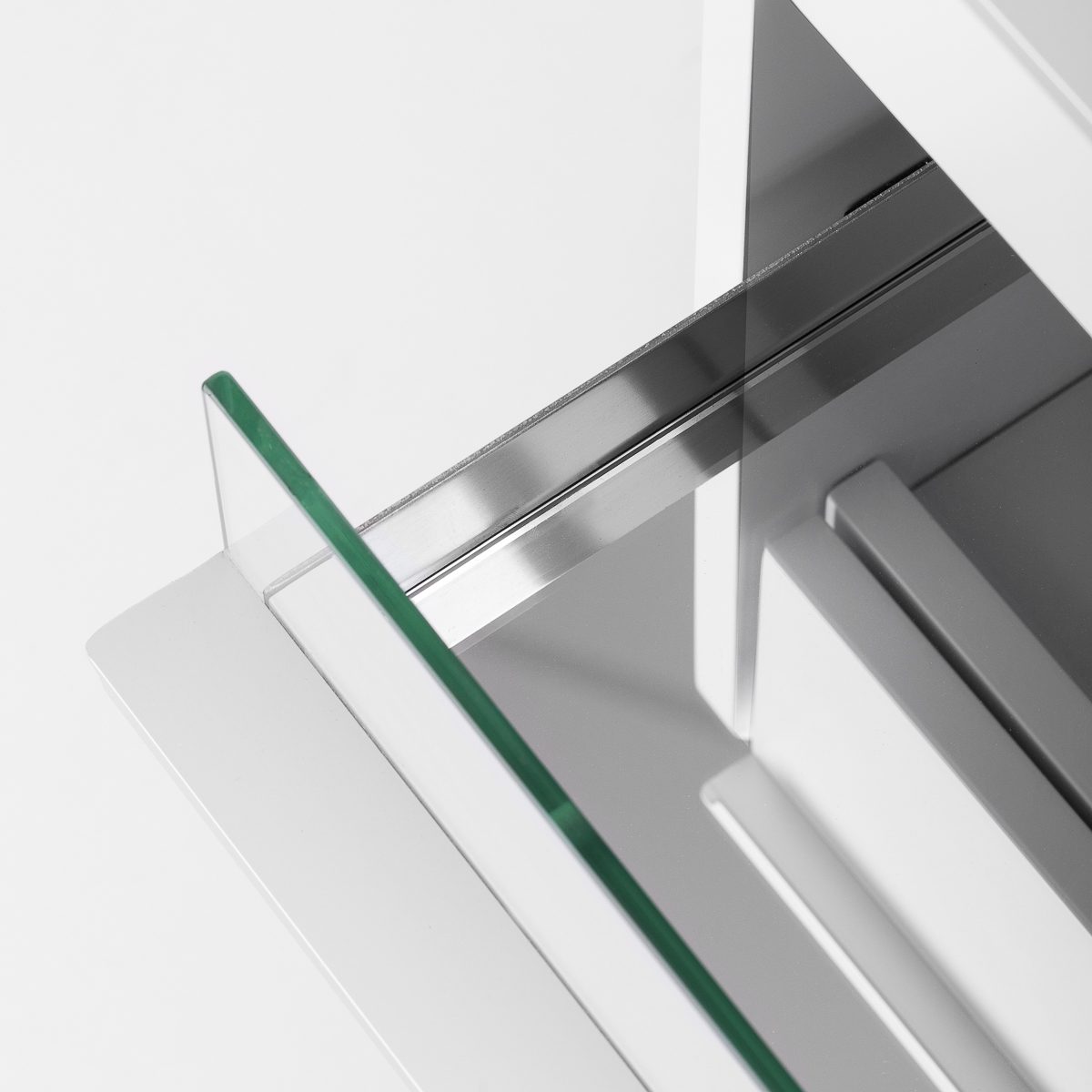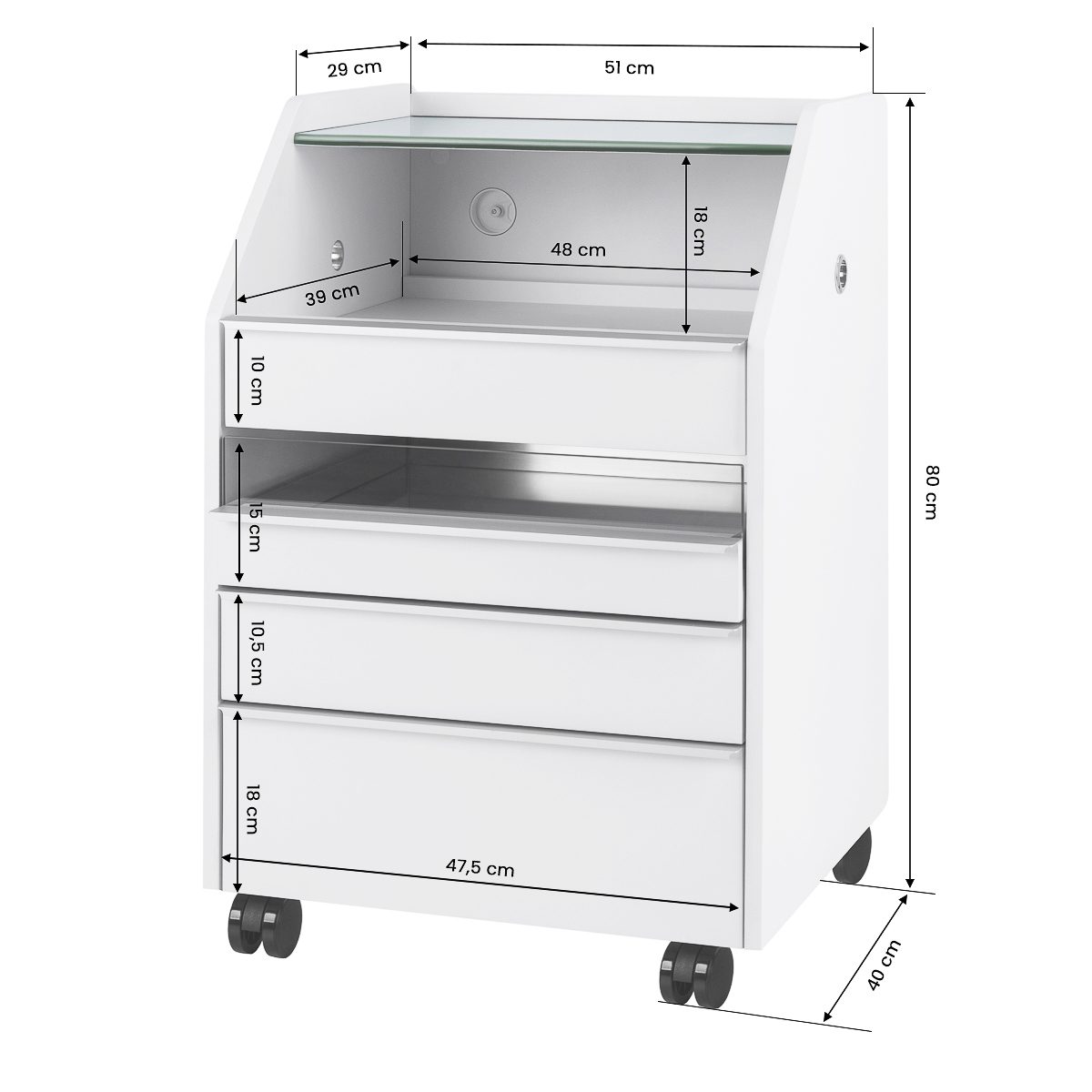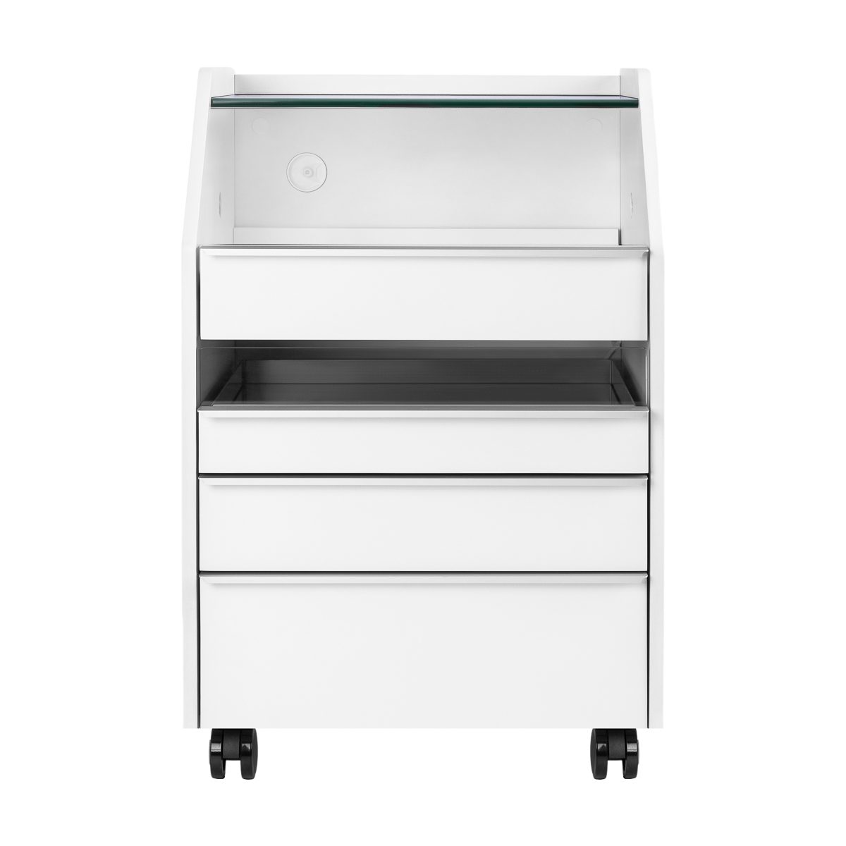 Kapea ylempi lasihylly mahdollistaa usein käytettyjen tarvikkeiden kätevän säilytyksen. Apupöytä on varustettu neljällä erikokoisella laatikolla, mikä helpottaa työvälineiden ja tuotteiden pitämistä järjestyksessä. Sisäänrakennettu lokerikko auttaa välineiden sijoittelussa varmistaen nopean pääsyn tarvittaviin varusteisiin ja lisäten mukavuutta hoitojen aikana. Ylemmän avoimen hyllytason korkeus on mitoitettu niin, että siihen mahtuu vaivatta esimerkiksi imurilla varustettu kynsipora.