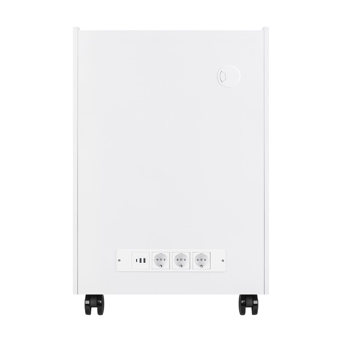 Apupöydän takapaneelissa on kolme pistorasiaa, kaksi USB-porttia ja yksi USB-C-portti, mikä mahdollistaa erityyppisten laitteiden vaivattoman kytkemisen. Seinämissä lähellä ylälaatikkoa sijaitsevat läpiviennit auttavat pitämään johdot järjestyksessä. Integroitu suurennuslasilampun pidike mahdollistaa lampun varren tukevan kiinnityksen lähelle hoitoaluetta viemättä tilaa työtasolta, mikä edistää tarkkaa valaistusta ja ergonomista työskentelyä.