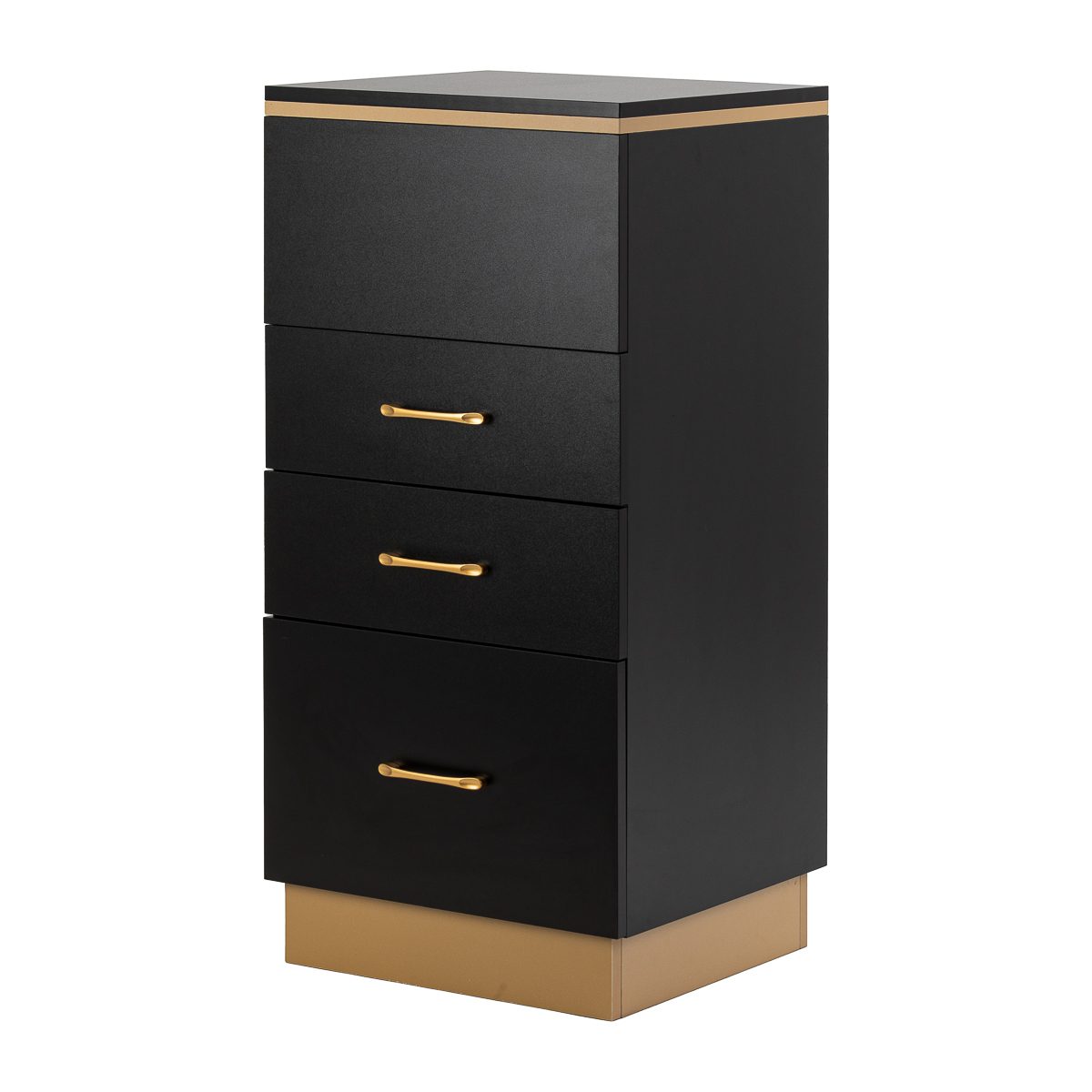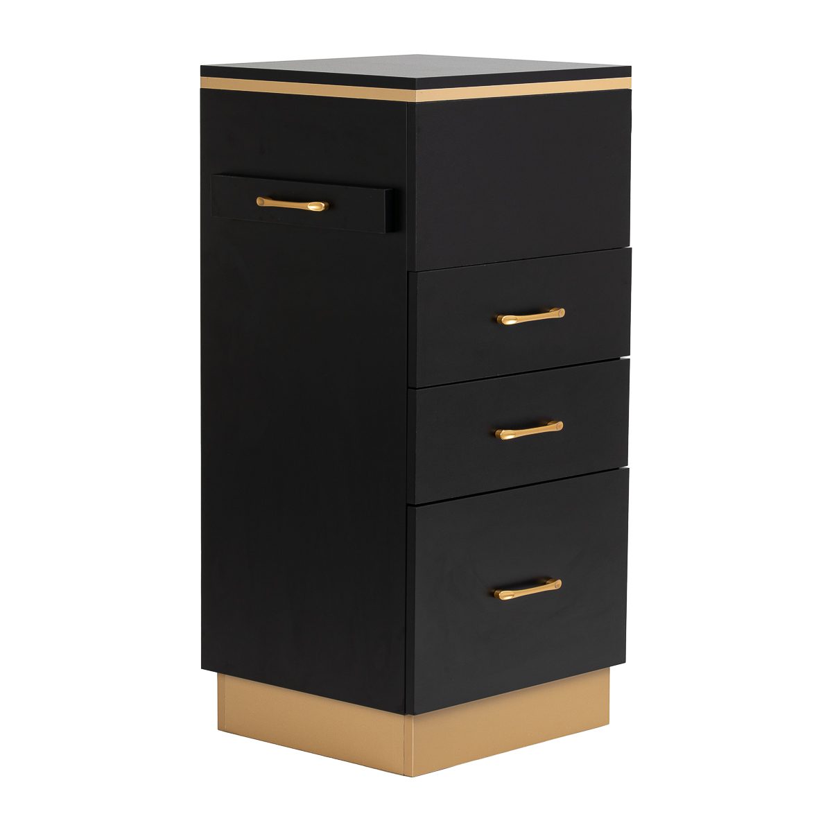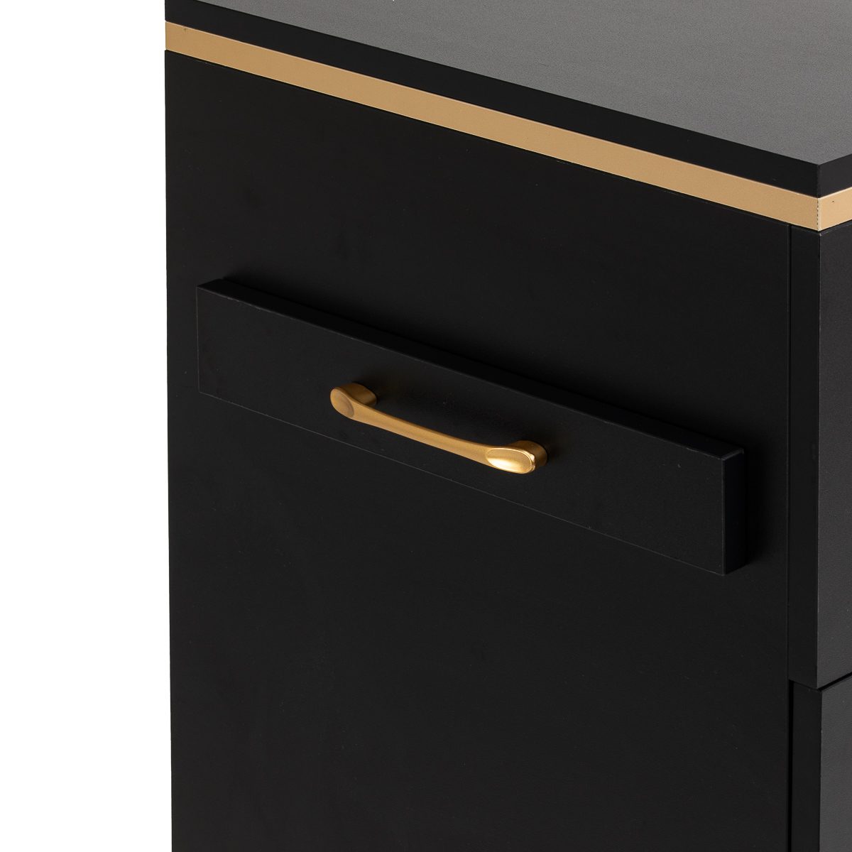 Muotoilun ja toiminnallisuuden yhdistelmä Klassisen mustan ja kullan yhdistelmä antaa apupöydälle modernin ja arvokkaan luonteen, joka sopii täydellisesti sekä minimalistisiin että näyttävämpiin sisustuksiin. Vankka rakenne varmistaa vakauden, ja sileä pinta helpottaa huonekalun puhtaanapitoa. Kultaiset vetimet eivät ainoastaan korosta eleganttia muotoilua, vaan varmistavat myös jokaisen laatikon vaivattoman avaamisen. Se on käytännöllinen ratkaisu kampaamoon, jossa järjestys, välineiden vaivaton saatavuus ja työpisteen estetiikka ovat tärkeitä.