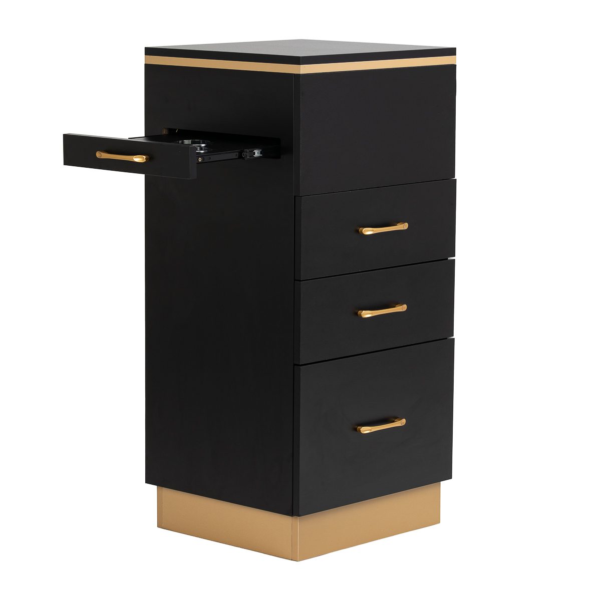 Toiminnallinen säilytys Mallissa on kolme tilavaa vetolaatikkoa, joiden avulla tavaroiden pitäminen järjestyksessä ja tarvittavien välineiden järjestely on helppoa. Oikeat mitat mahdollistavat sekä pienten työkalujen että suurempien kampaamotuotteiden säilytyksen, joten kaikki tarpeelliset välineet ovat aina yhdessä paikassa.
