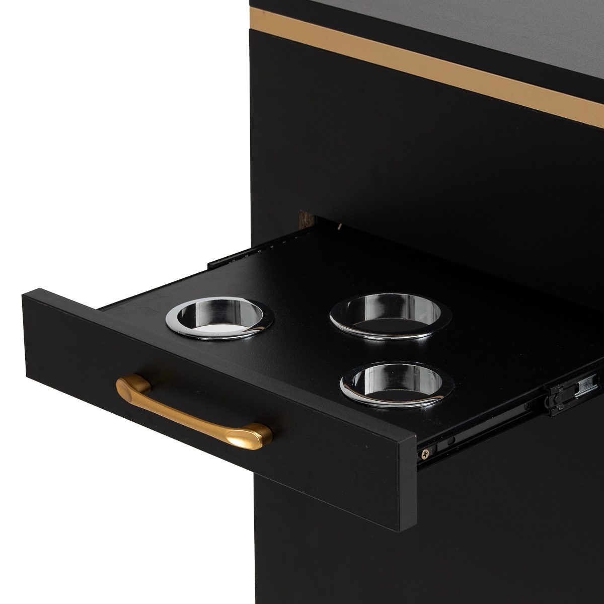 Ulosvedettävä sivutaso Apupöydässä on lisäksi ulosvedettävä sivutaso, jossa on metalliset pidikkeet työkaluille. Kolme aukkoa sopivat täydellisesti hiustenkuivaimen, kihartimien, suoristusraudan tai harjojen säilytykseen, mikä mahdollistaa laitteiden kätevän pitämisen esillä käsittelyn aikana. Tämä ratkaisu tarjoaa vapaan pääsyn tärkeimpiin työkaluihin ilman, että niitä tarvitsee laskea työtasolle.