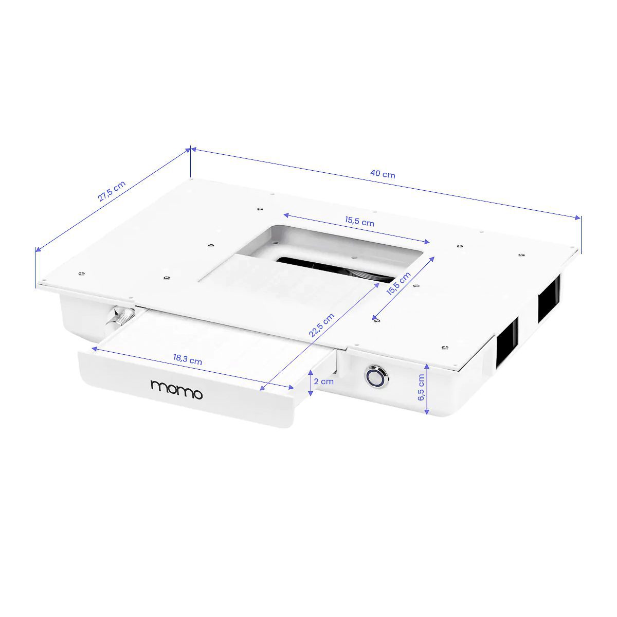 Pöytälevyyn sisäänrakennettu Momo J-02 -kasettipölynimuri parantaa merkittävästi työskentelymukavuutta ja hygieniaa poistaen tehokkaasti kosmeettisten hoitojen, kuten manikyyrien, aikana syntyvän pölyn. Tämän laitteen ansiosta ilma salongissa pysyy puhtaana ja työpiste vapaana epäpuhtauksista, mikä lisää sekä kosmetologin että asiakkaiden turvallisuutta. Pölynimuri on helppokäyttöinen ja -huoltoinen, mikä lisää sen toiminnallisuutta entisestään. Säännöllinen puhdistus ja suodattimen vaihto takaavat jatkuvasti korkean imutehon. Lisävaihtosuodattimia on mahdollista ostaa erikseen (SKU 123581). Myymälästämme on saatavilla myös aktiivihiilisuodatin (SKU 123582), joka poistaa tehokkaasti allergeeneja ja mikrobeja, nostaen salongin hygieniatasoa.
