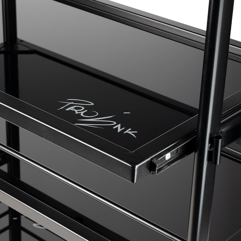 Työkärry pyörillä PRO INK 1015 tatuointivälineiden säilytykseen. Vankan teräsrakenteensa ansiosta se takaa pitkän kestävyyden ja neljälle lasihyllylle mahtuu kaikki mitä tarvitset istunnon aikana.