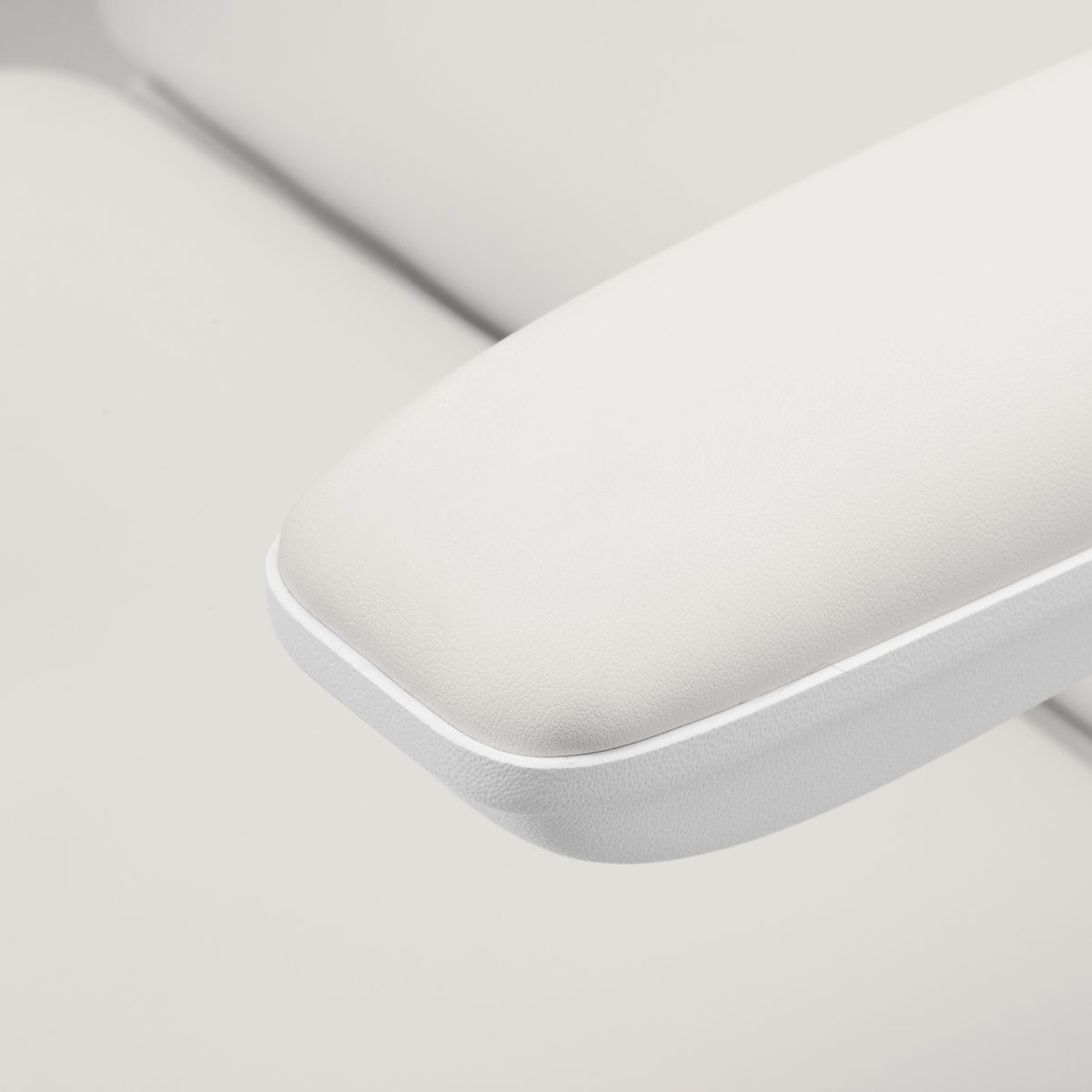 Vakaa, vankka jalusta takaa paitsi tuolin kestävyyden myös turvallisuuden ja mukavuuden päivittäisessä työssä. Malli on täytetty vaahtomuovilla ja päällystetty nahanjäljitelmällä elegantin valkoisena – tämä materiaali on miellyttävän tuntuinen, kosteudenkestävä sekä helppo pitää puhtaana. Virtaviivainen muoto ja minimalistinen viimeistely antavat kokonaisuudelle modernin, esteettisen ilmeen, joka sopii täydellisesti sekä klassisiin että moderneihin sisustuksiin.