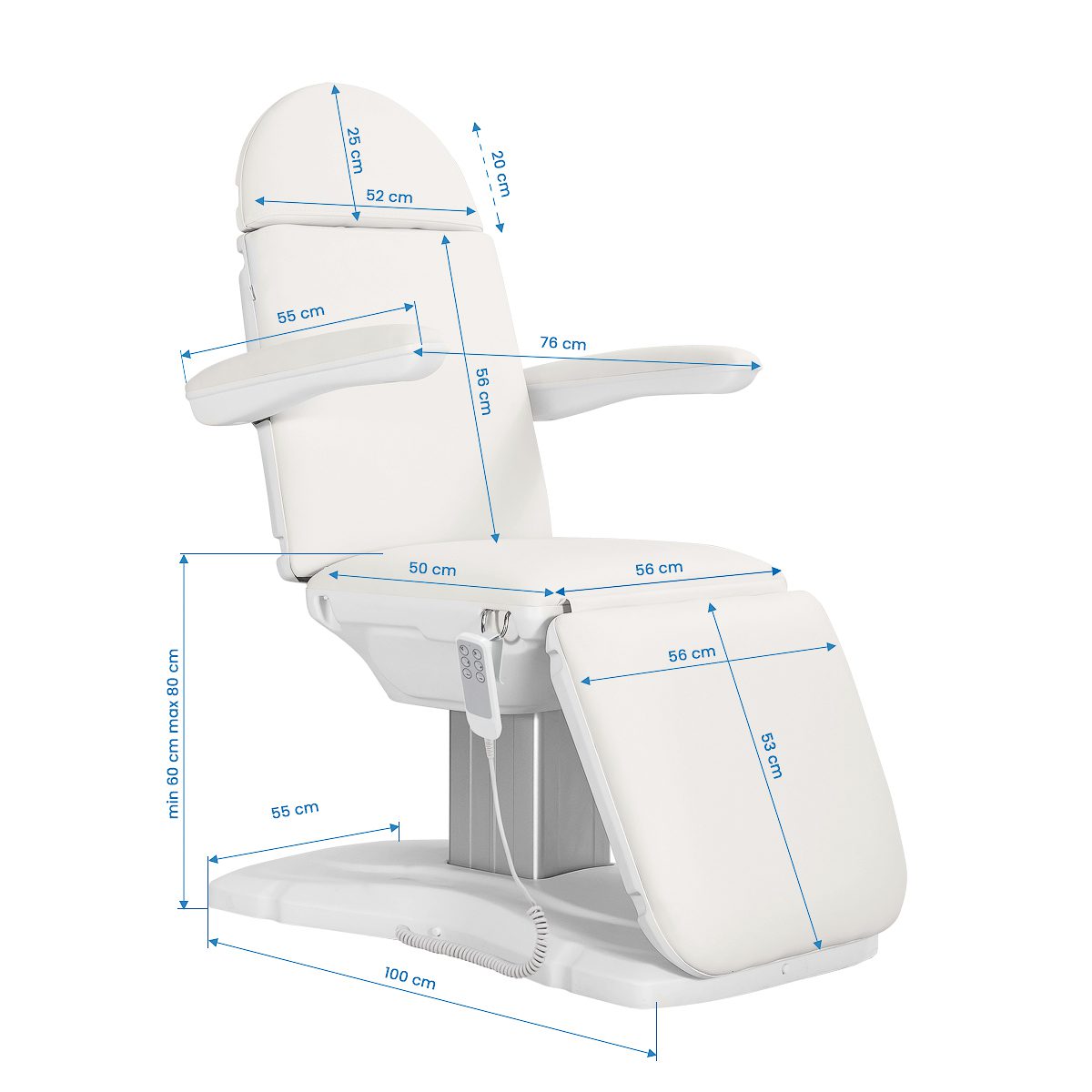 Intuitiivisella kaukosäätimellä voit säätää tuolia kolmessa tasossa – korkeus, selkänojan kallistus sekä jalkatuen kallistus. Tämä mahdollistaa tuolin portaattoman säätämisen mukavaan makuuasentoon, mikä tekee sekä kasvo- että vartalohoitojen suorittamisesta miellyttävää. Istuinkorkeus on säädettävissä 60–80 cm:n välillä, mikä mahdollistaa asennon mukavan sovittamisen sekä asiakkaan että käsittelyn suorittajan pituuteen. Täysin makuuasentoon säädettynä tuoli on yli 2 metriä pitkä, mikä takaa mukavuuden myös pidemmille käyttäjille. Käyttömukavuuden lisäämiseksi kaukosäätimen voi ripustaa istuimen molemmilla puolilla oleviin pidikkeisiin, mikä helpottaa sen säilytystä ja varmistaa, että se on aina käden ulottuvilla.