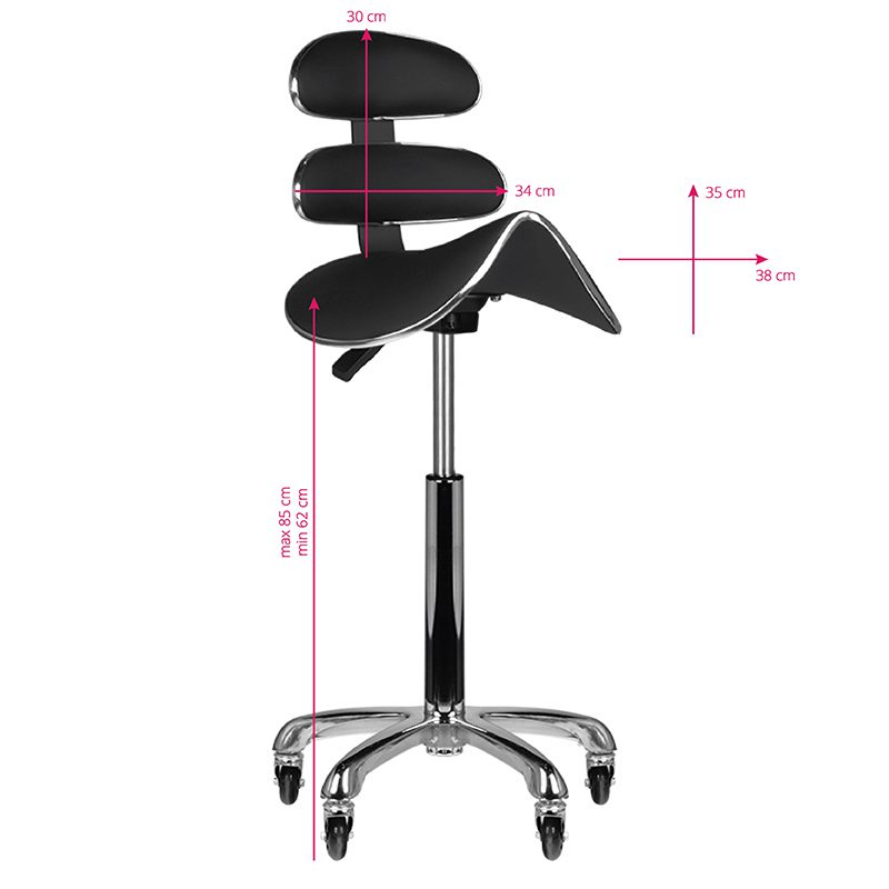Mukava ja tyylikäs satulatuoli. Selkänojalla ja korkeuden säätö. Verhoilu on laadukasta keinonahkaa. Kumipyörät.