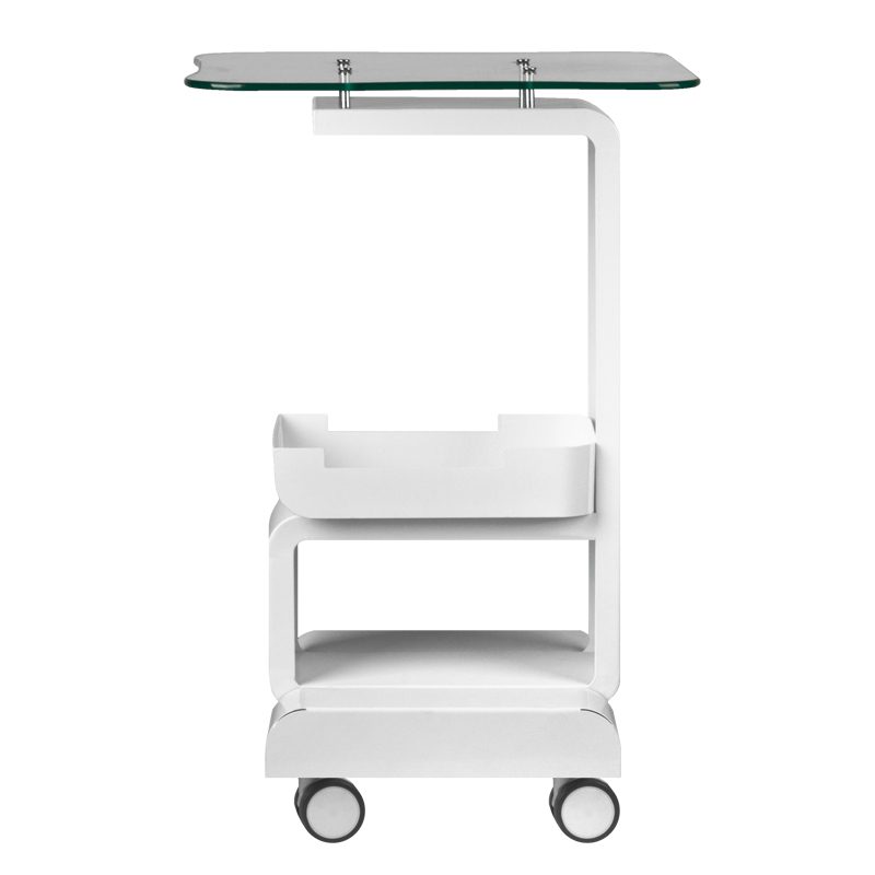 Käytännöllinen ja vankka teline kauneudenhoitolaitteille. Valmistettu metallista ja lasista. Lukittavat kumipyörät.